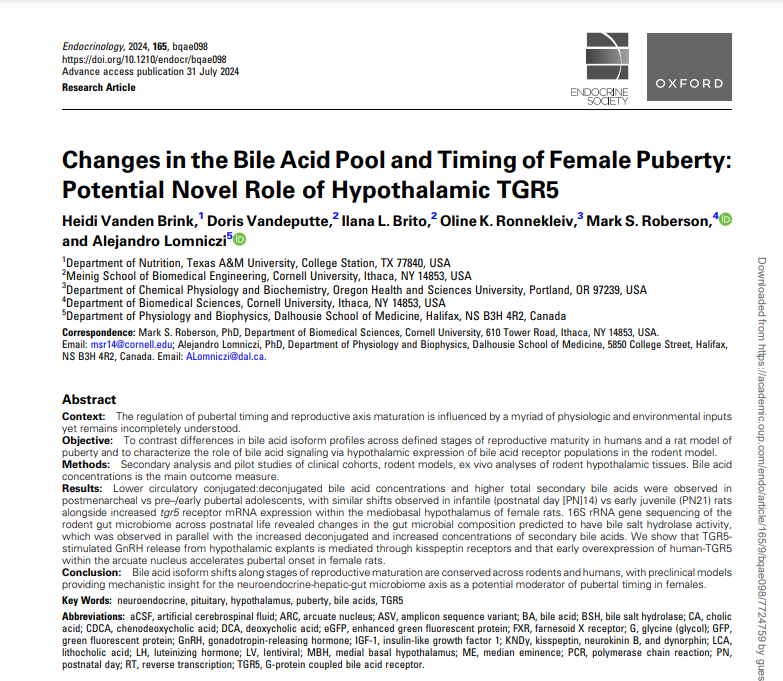 This summer, Dr. Heidi Vanden Brink published a new paper in Endocrinology, with the collaboration of Dr. Mark Roberson at Cornell University and Dr. Alejandro Lomniczi at Dalhousie School of Medicine. These exciting findings provide novel evidence for a hepatic-gut microbiome-reproductive axis and its role in the modulation of reproductive maturity.
